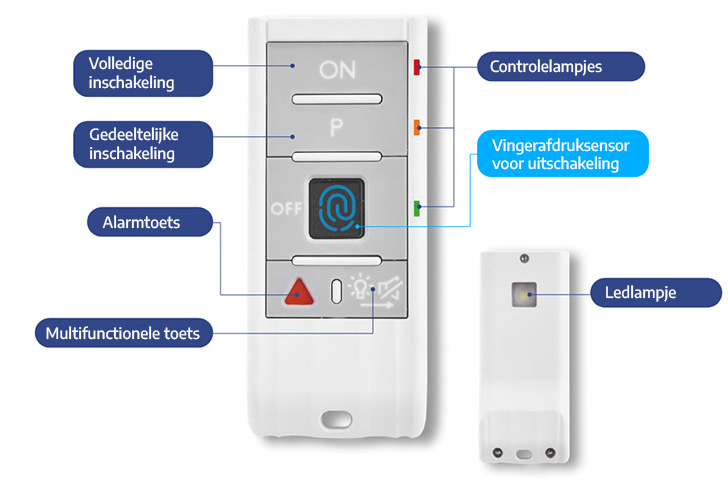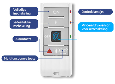 Deze vult het assortiment bedieningselementen van uw alarmsysteem aan: het toetsenbord, de standaard afstandsbediening en de mobiele app.